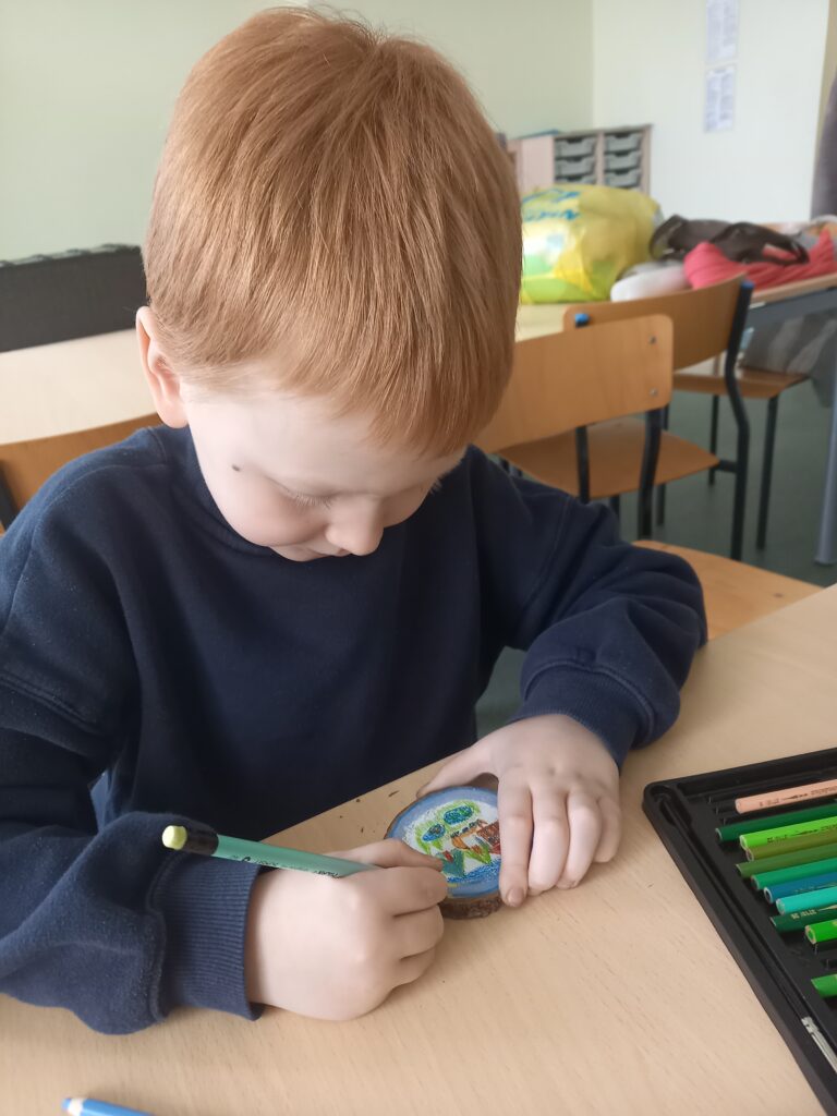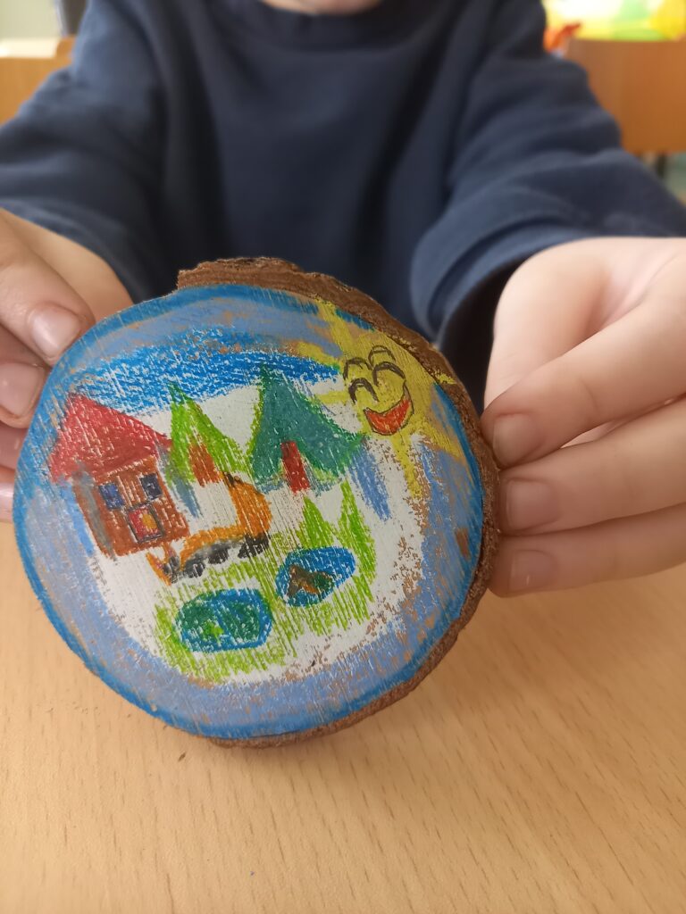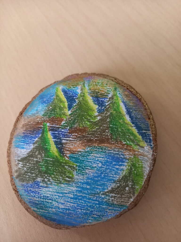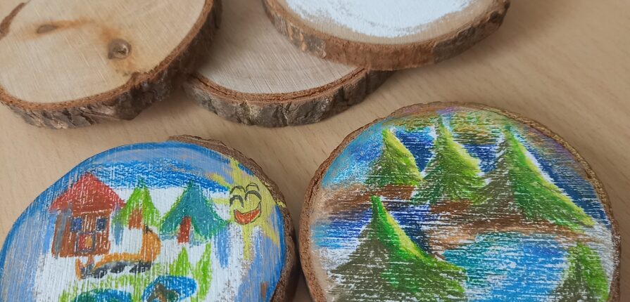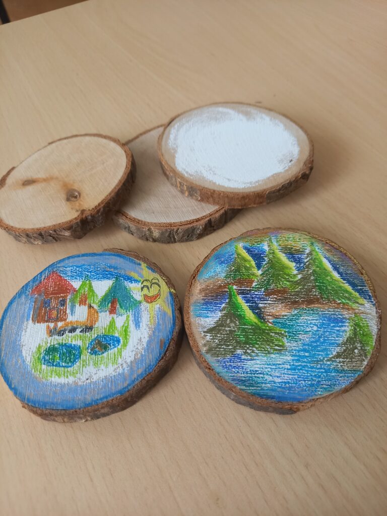 Podczas ostatnich zajęć artystyczno-terapeutycznych uczniowie mieli okazję uczestniczyć w wyjątkowych warsztatach plastycznych, łączących twórczość z relaksem i uważnością. Tym razem pracowaliśmy z kredkami akwarelowymi, tworząc nastrojowe pejzaże na małych, drewnianych plastrach.