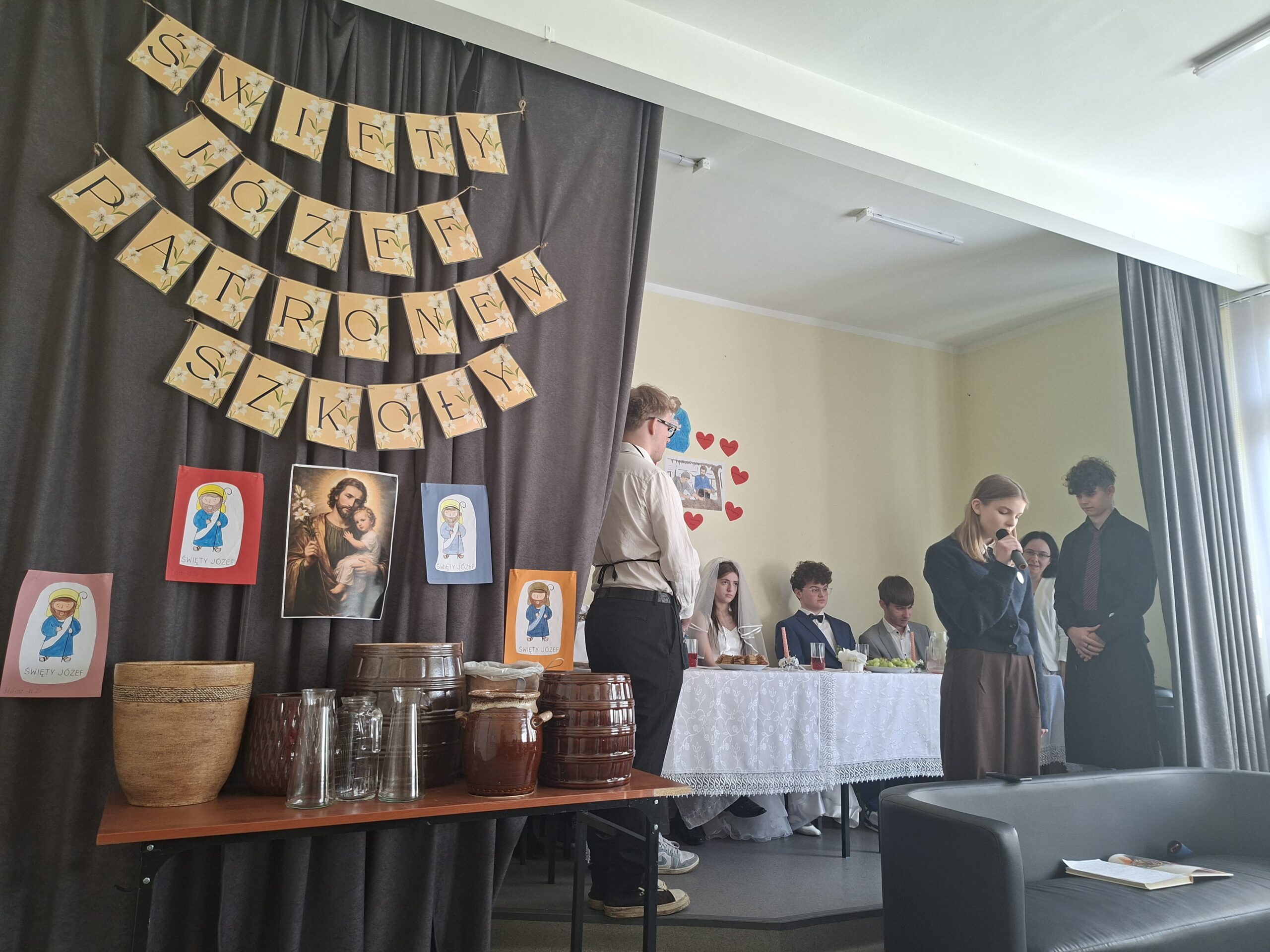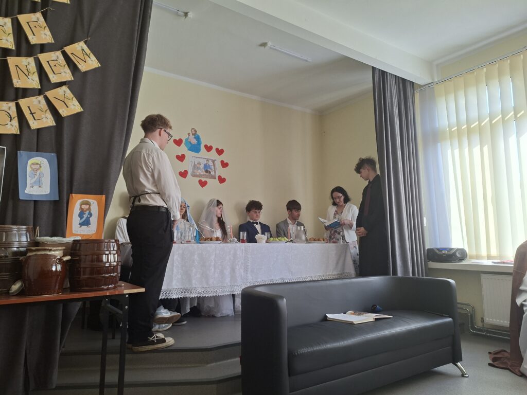 Uczniowie pod kierunkiem p. Janiny, naszej katechetki i p. Agnieszki – wychowawcy, przygotowali piękne przedstawienie przybliżające postać i rolę św. Józefa oraz – z racji nazwy naszej szkoły – przedstawili przypowieść o cudzie, jakiego dokonał Jezus na weselu w Kanie Galilejskiej.